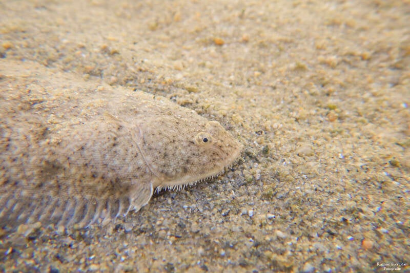 Tijdens één van onze twee snorkelavonturen in Bretagne liepen mijn man en ik het water in toen iets wits onze aandacht trok. Het leek op het rugschild van een inktvis, wat wel vaker op het strand aanspoelt en dat was dan ook exact wat ik in gedachten had toen ik het wilde oppakken. Maar zodra ik het aanraakte voelde het wel heel zacht aan. Met een gilletje liet ik het los, waarna het dier zich omdraaide en wegschoot. Ik zag hem een stukje verderop weer op de grond gaan liggen. Dit keer met zijn bruine kant boven, waardoor hij bijna niet te zien was. Voorzichtig liep ik dichterbij en knielde naast hem neer. Door mijn duikbril kon ik hem haarscherp zien, het was een tong! Dit is een vis met een nogal apart uiterlijk zoals je op de foto's kan zien en het was dan ook ontzettend gaaf om er eentje tegen te komen. Zijn platte uiterlijk heeft hij overigens niet op het moment dat hij geboren wordt. Dan is het nog een normaal gevormde vis, zoals je een vis voor je ziet. Maar zodra hij ongeveer 1 cm groot wordt begint zijn metamorfose naar een platte vis met zijn ogen naast elkaar aan de rechterkant op zijn lichaam. Doordat hij zo'n apart lichaam krijgt en hij ook nog een geweldige zandschutkleur heeft, kan hij goed jagen. Hij graaft zich dan deels in het zand in en vanuit daar kan hij snel toeslaan zodra er een lekkere worm of kreeftachtige langs komt.