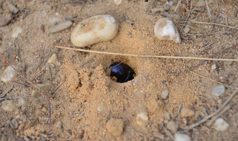 Tijdens het wandelen op de Posbank kwam ik ontzettend veel mestkevers tegen. Het was te merken dat de zomer aan zijn eind kwam, want de meeste lagen spartelend op hun rug. Hun taak zit er weer op, ze hebben als het goed is gezorgd dat er volgend jaar weer enorm veel mestkevers zullen rond lopen. Maar dit is niet waarom ik een artikeltje over de mestkevers ben begonnen. Ik kwam op een stuk zanderige bodem deze groep gaatjes in de grond tegen (foto 1). Er was juist een kever in het gaatje aan het graven, waardoor ik kon zien dat het een mestkever was (foto 2). Dit had ik nog nooit gezien en ik vroeg me dan ook af waarom hij dit aan het doen was. Na een ander gaatje een beetje te hebben uitgegraven, ontdekte ik dat er een andere mestkever onder het zand zat. Ik vond het maar vreemd en mailde Roots hier over. Zij vertelde mij dat dit heel normaal is. Een deel van de mestkevers gaat namelijk niet dood, maar overwinterd onder de grond. Deze Mestkevers waren zich dus klaar aan het maken voor een lange winterslaap!