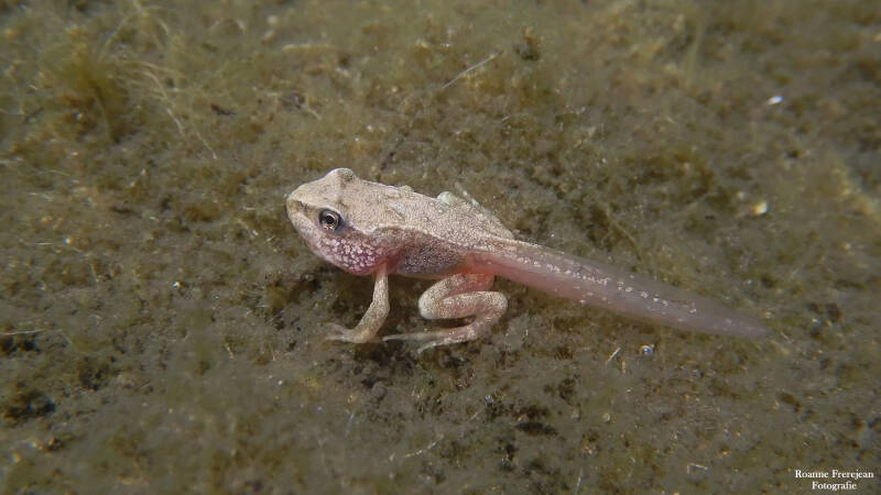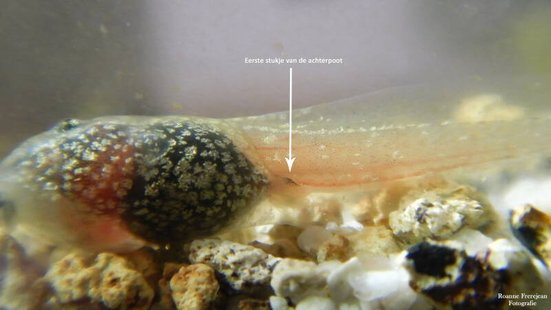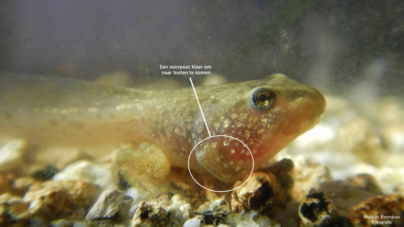 Afgelopen voorjaar lag er een enorme klomp kikkerdril in onze vijver. Er zitten redelijk grote vissen in de vijver, waardoor de overlevingskans van de eitjes vrij klein was. Daarom besloot ik om er een paar eitjes uit te halen en in een aquarium te plaatsen. Een maand lang heb ik op mijn kamer hun groei kunnen fotograferen en bekijken. Op het moment dat ze voorpootjes kregen heb ik ze verplaatst naar een grotere bak buiten. Hier konden ze op meerdere plekken uit het water kruipen, wat erg belangrijk is in deze fase, ook konden ze zelf vliegjes vangen. Nog ongeveer een halve maand heb ik ze kunnen volgen, hierna zijn ze een voor een uit de bak gekropen en de wijde wereld in getrokken.