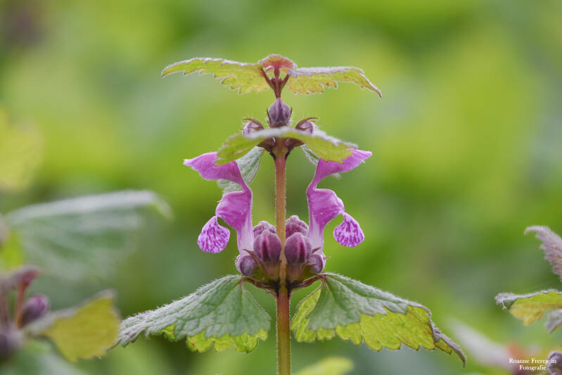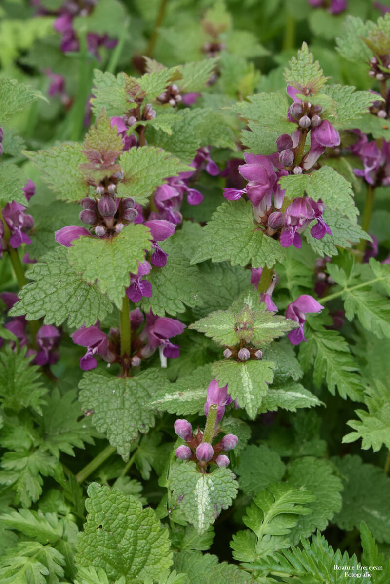 Op deze foto kan je goed het verschil zien tussen de gekweekte gevlekte dovenetel die oorspronkelijk uit de tuin komt en de wilde variant. De gekweekte heeft namelijk vaak witte vlekken of strepen en de wilde niet. Beide komen veel voor in het Laakbos.