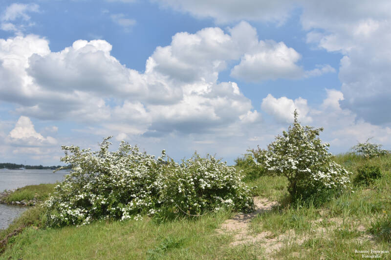 Deze rustige en mooie uiterwaard ligt tussen de dorpen Heerewaarden en Veluwe. Als ik aan een uiterwaard denk, zie ik grasvelden met enkele bomen en daarna zand met de rivier voor me. Zo zou je dit gebied ook kunnen omschrijven, maar dan doe je het toch echt te kort. Vanaf de klinkerweg zie je inderdaad een behoorlijk groot veld voor je. Maar dit veld bestaat niet uit gemaaid groen gras, maar uit zacht wiegende grashalmen en vele soorten bloemen. Vooral aan de randen bij de rivierkant kan je allerlei bloemen vinden. Wede, bieslook (wat beide niet veel voorkomende planten zijn), het roze schapenzuring, de prachtige rimpelroos, helder witte akkerhoornbloemen en gele wilde reseda. En dit is nog maar een kleine greep uit de vele mooie bloemen die hier groeien!