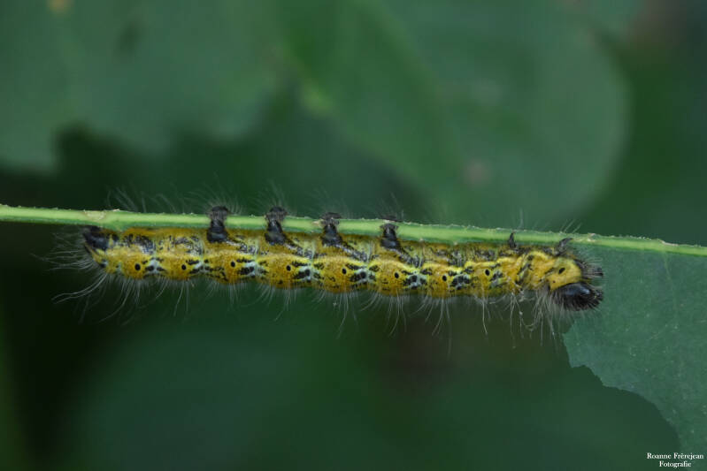 In dezelfde laan ontdekte ik ook twee soorten rupsen. Beide zijn erg indrukwekkend en absoluut de moeite waard om even naar te zoeken. De eerste is de wapendrager. Dit is een flink grote rups van maar liefst 6 cm lang, geel gekleurd met zwarte en witte patronen en lange witte haren. Als je hem ziet herken je hem meteen. Zijn tempo van eten past perfect bij zijn grootte, want hij eet snel. Het is dan ook leuk om even bij zo’n rups te blijven staan en te bekijken hoe hij duidelijk het blad opeet.