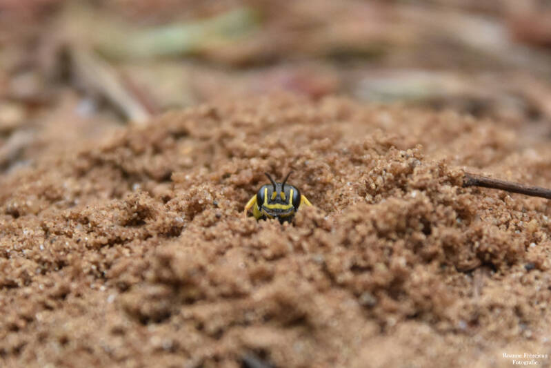 Terwijl ik zo door het bos liep, kwam ik aan de rand van het wandelpad iets tegen wat me eigenlijk wel verbaasde. Kleine hoopjes zand met een ingang erin. Normaal nestelen zandbijen of graafwespen zich op plekken met veel zonlicht zodat ze snel opwarmen en dus snel kunnen gaan vliegen. Maar hier was het vrij donker, door de vele hoge bomen en struiken. Om uit te zoeken wie hier nou leven, ben ik er even bij gaan zitten. En al na een paar minuten kwam er iemand naar zijn holletje gevlogen. Het was een gewone vliegendoder. Deze graafwespen jagen op vliegen en brengen die dan naar hun holletje waar ze de vliegen bij hun eitjes leggen. Zo’n holletje kan wel 50 cm diep zijn! Dat is dan ook de reden waarom de ingang vaak te midden van een flink hoopje zand zit. Nu is natuurlijk nog de vraag, wat doen ze midden in het bos? Er zijn weinig bloemen waar vliegen op afkomen, dus waar halen ze hun prooien dan vandaan? Ik weet het niet zeker, maar ik heb een theorie. Rond de holletjes staan ontzettend veel braamstruiken. Misschien heb je wel eens naar zo’n braamstruik gekeken op het moment dat de bramen al wat ouder begonnen te worden. Er zitten dan aardig wat vliegen op, die zich tegoed doen aan deze heerlijke vrucht. Ook hebben ze vrijwel heel de lente en zomer bloesems, waar vliegen net zo graag op afkomen. Daarom denk ik dat de vliegendoders vanaf deze plant hun vliegen vangen en daarom hier prima kunnen overleven.